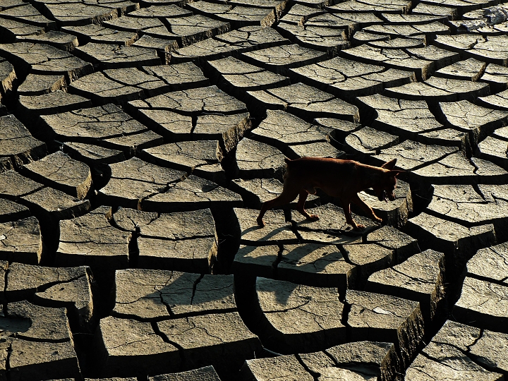 rostlin, popraskaná, skoro až pouštní krajina kolem břehů, hledači
