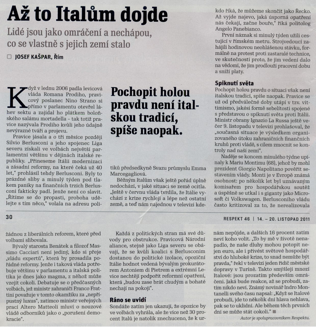 ▪ Až to Italům dojde - Respekt 46, 13. 11. 2011 19:50 - Josef Kašpar, Řím